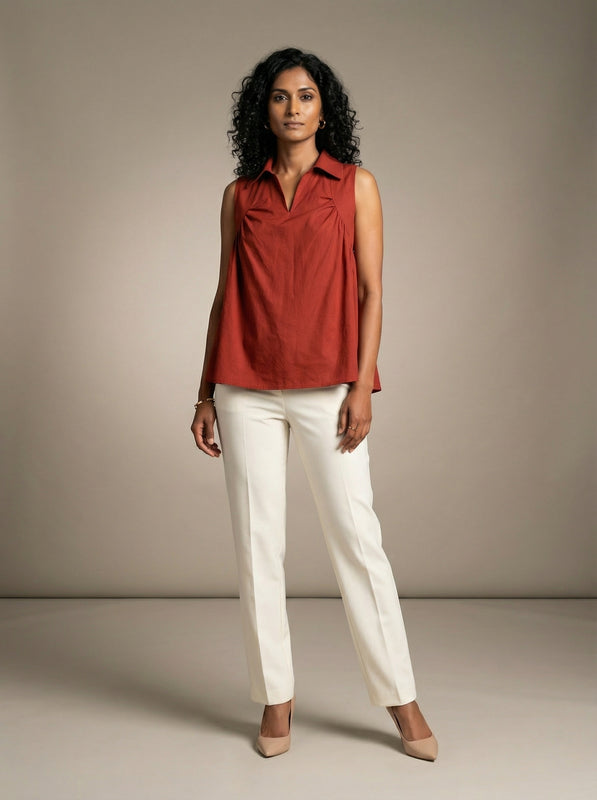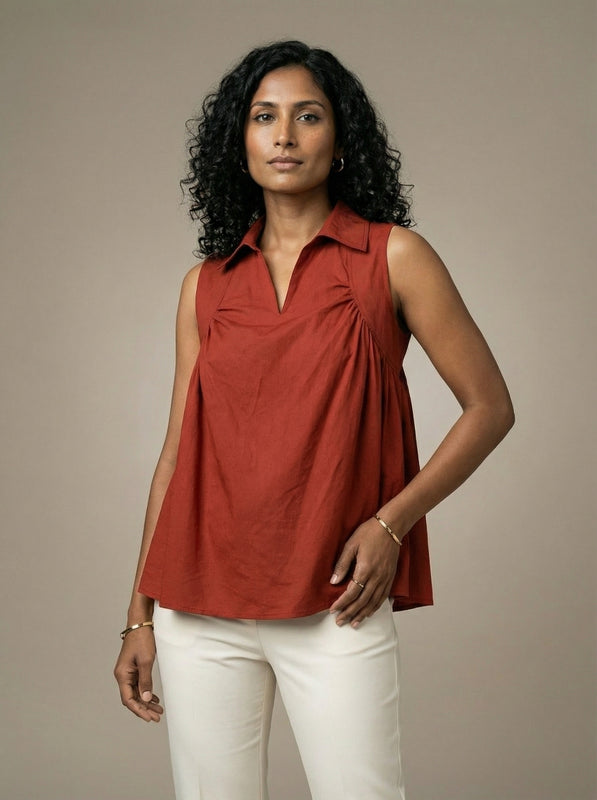 An earthy red A-line sleeveless top with a collared neckline, designed for effortless formal styling.