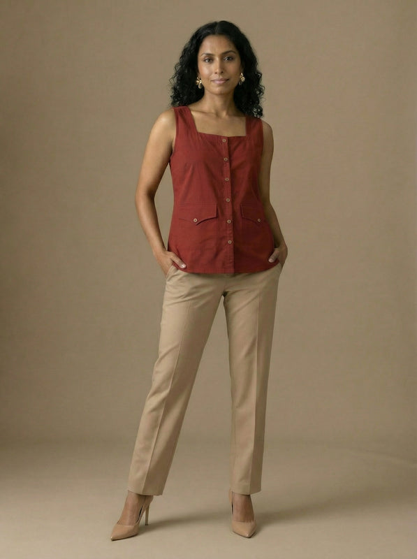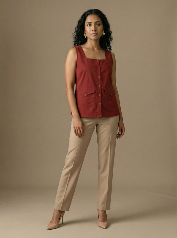 This square neck sleeveless top combines utility pockets with clean lines, making it a smart and functional choice for formal workwear.