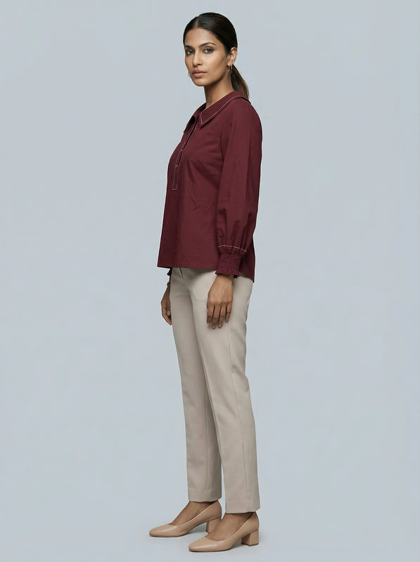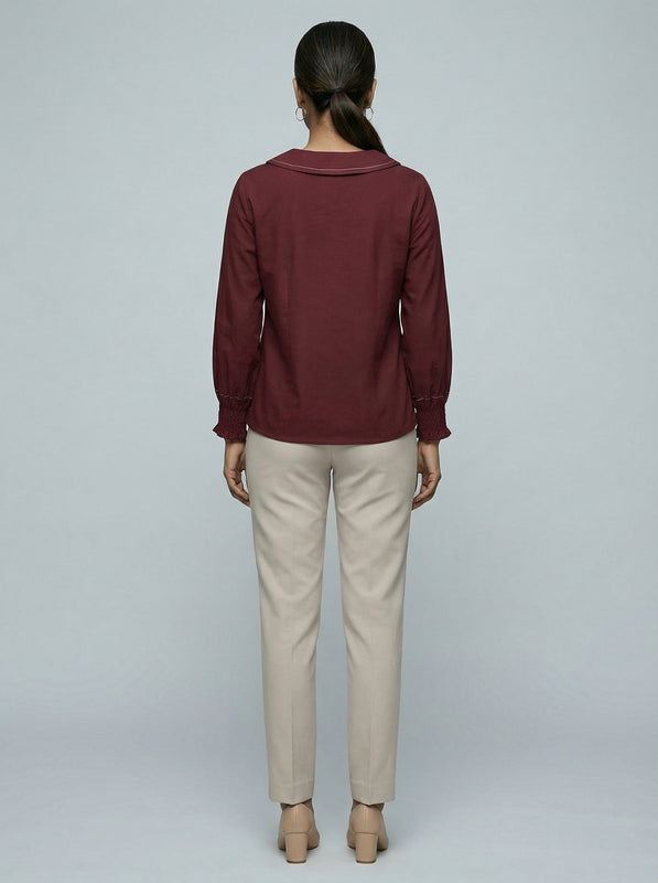 This maroon long sleeve top features contrast stitch detailing that adds depth without overpowering the design, making it a dependable formal staple.