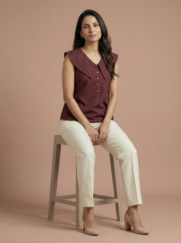 This maroon sleeveless top blends classic tailoring with everyday comfort. The wide collar detail adds structure, making it an easy pick for formal office wear.