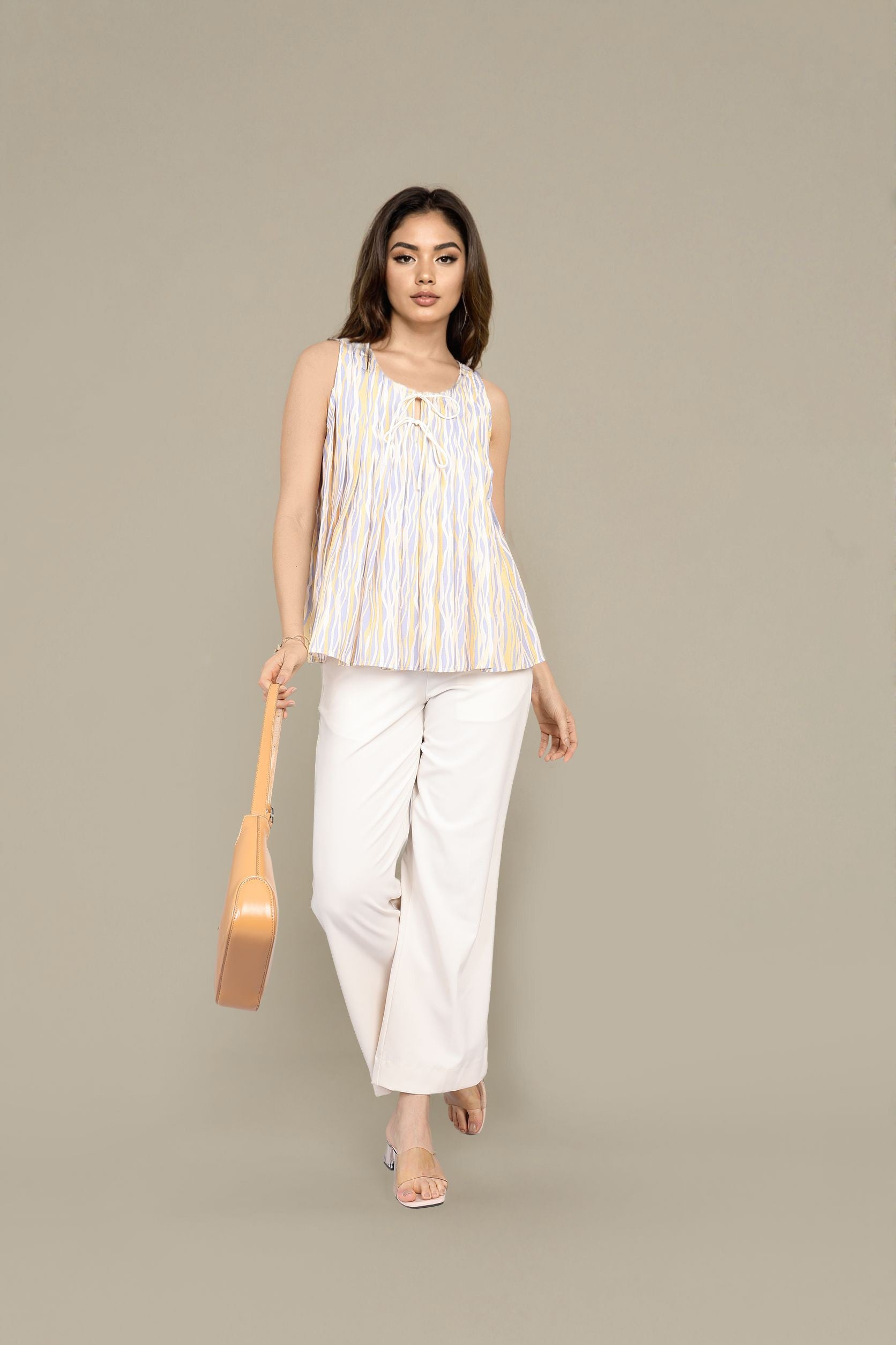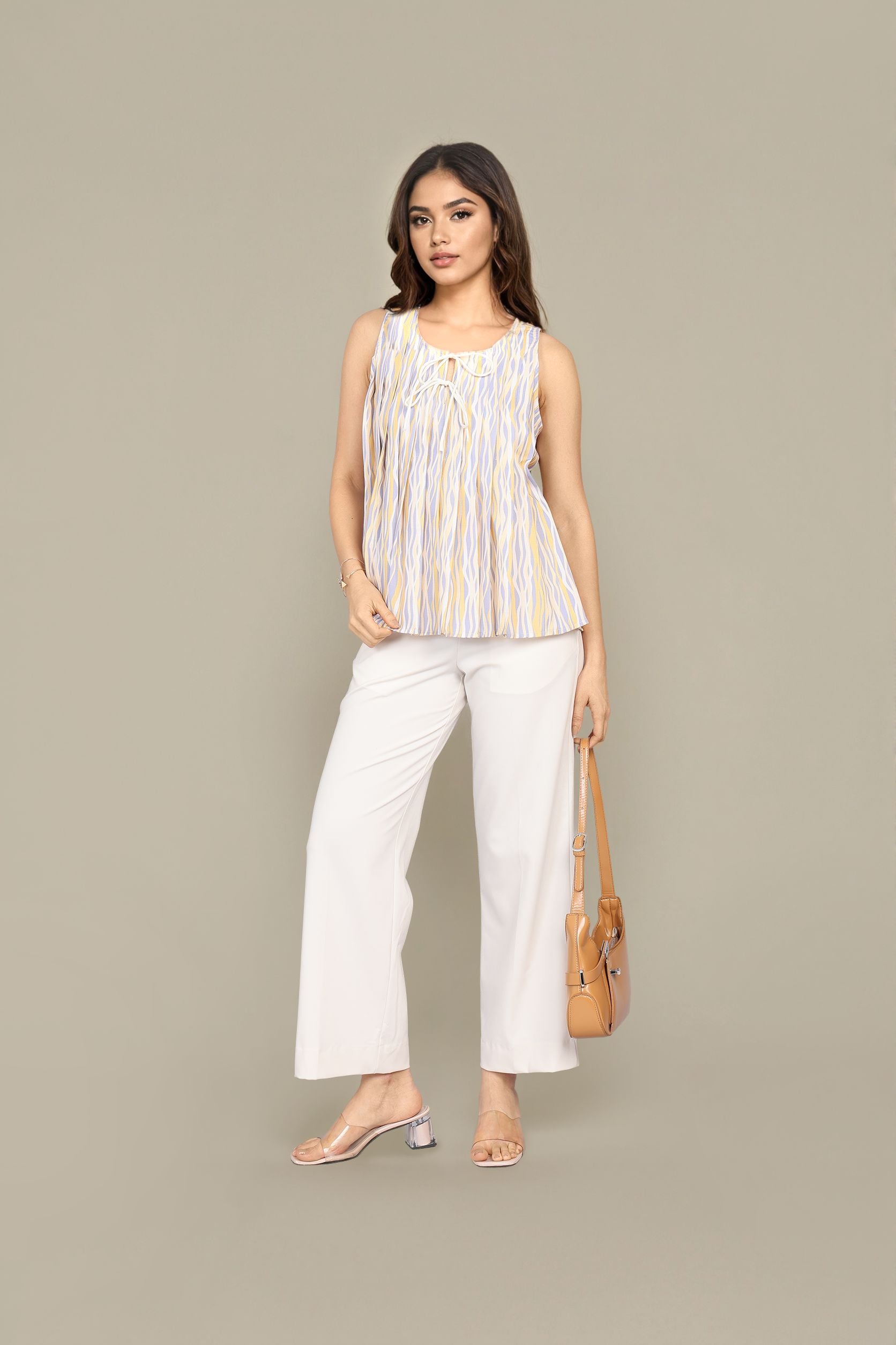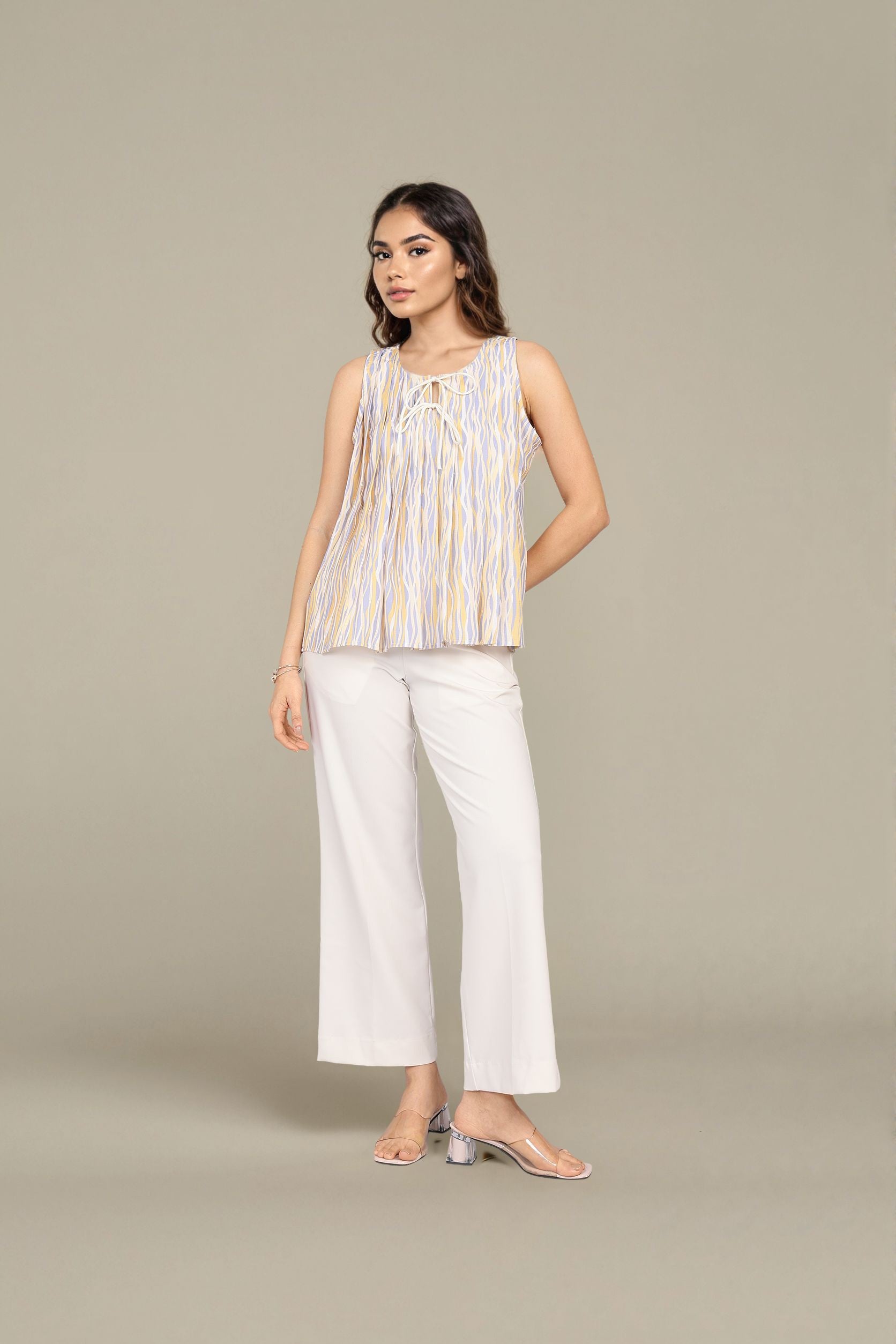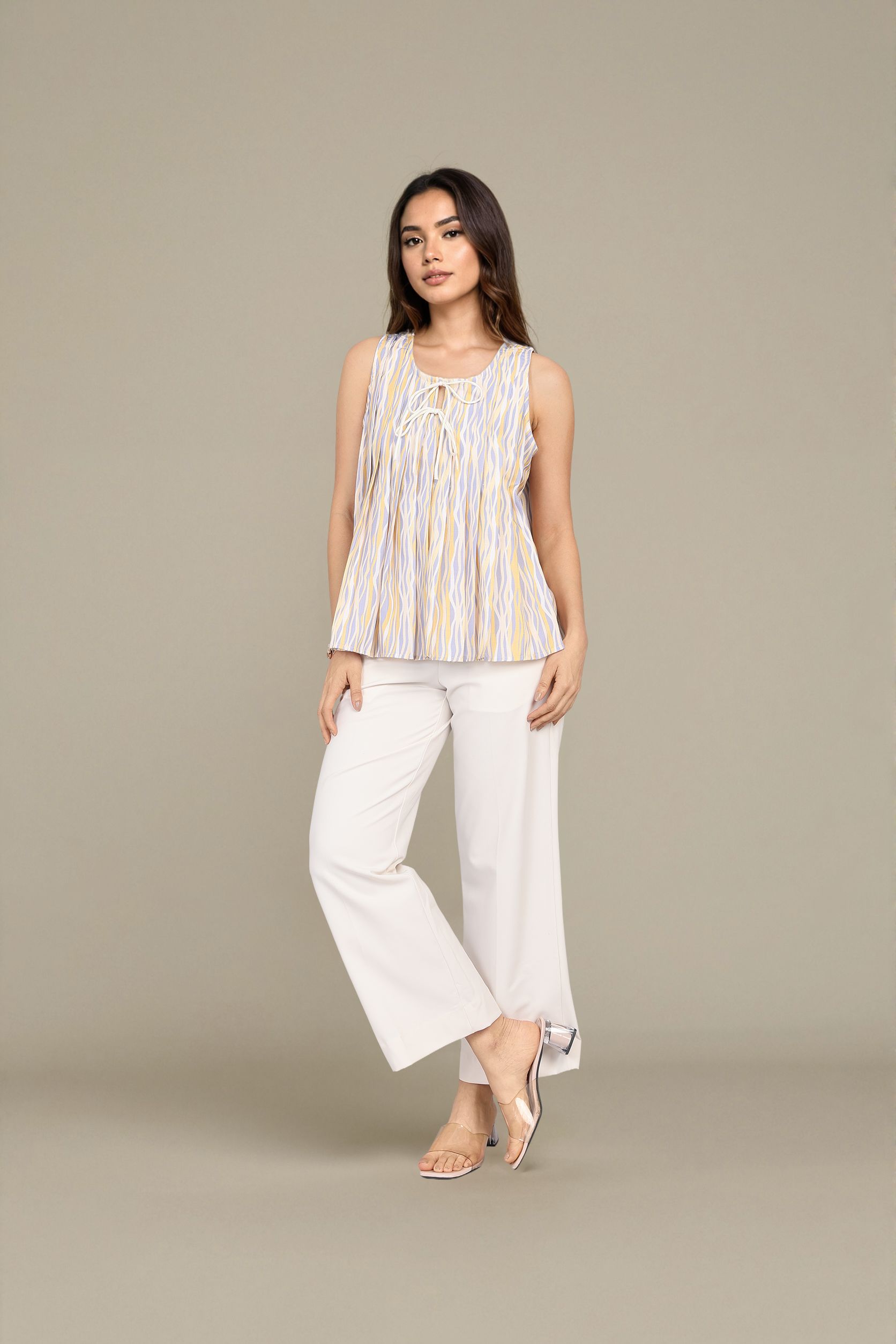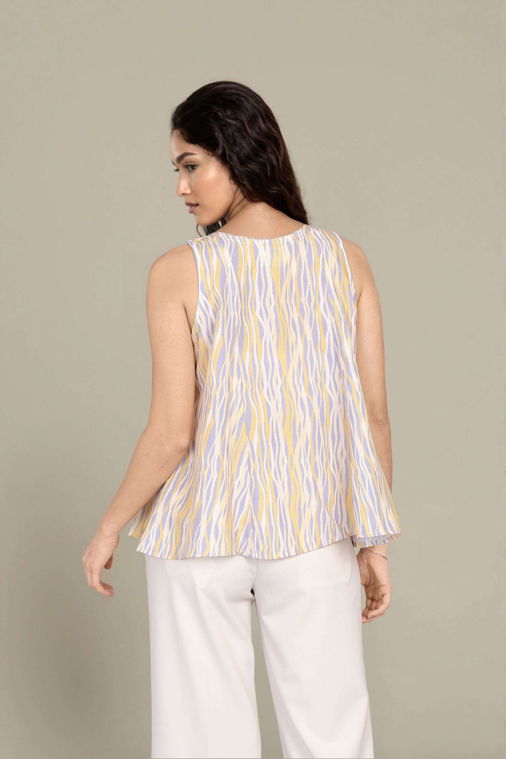 A vibrant multi color sleeveless top with pleated detailing and a smooth round neck. Perfect for a fresh, daytime look.