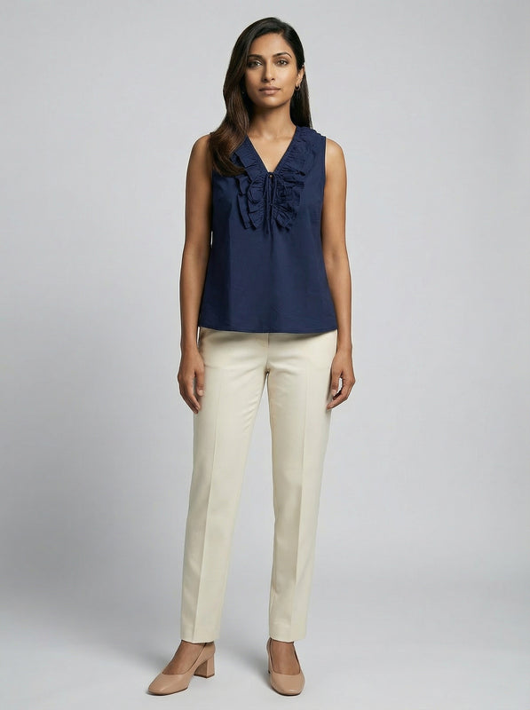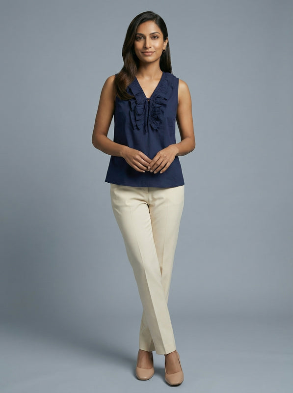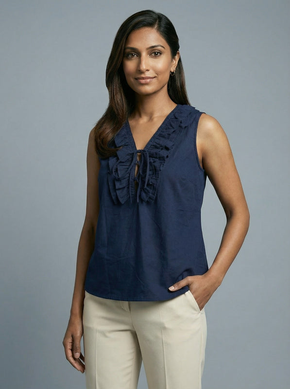 A navy blue sleeveless top with a ruffled V-neck that adds gentle detail while staying perfectly suited for formal office wear.