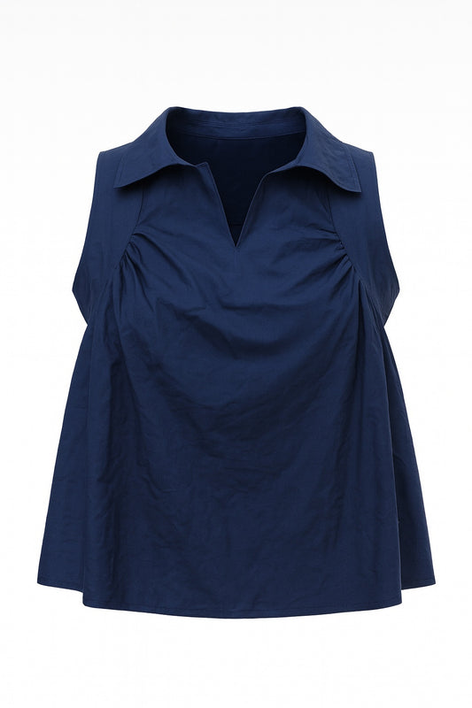 This navy blue A-line sleeveless collared top delivers a structured yet relaxed look, perfect for formal office wear.