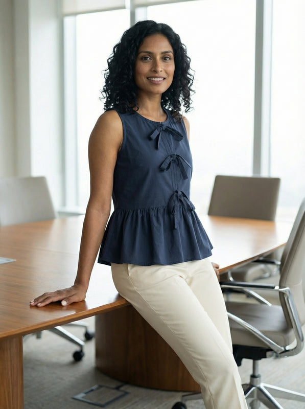 A navy blue round neck peplum top designed to offer comfort and structure, making it suitable for long workdays.
