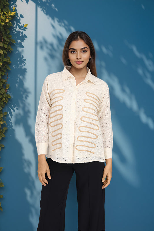 Style Tip:Team this white Schiffli cotton top with denim shorts and flat sandals for a fresh summer vibe. For a more polished appearance, layer it with a light blazer and swap the shorts for linen trousers, keeping jewelry delicate to highlight the embroidery.