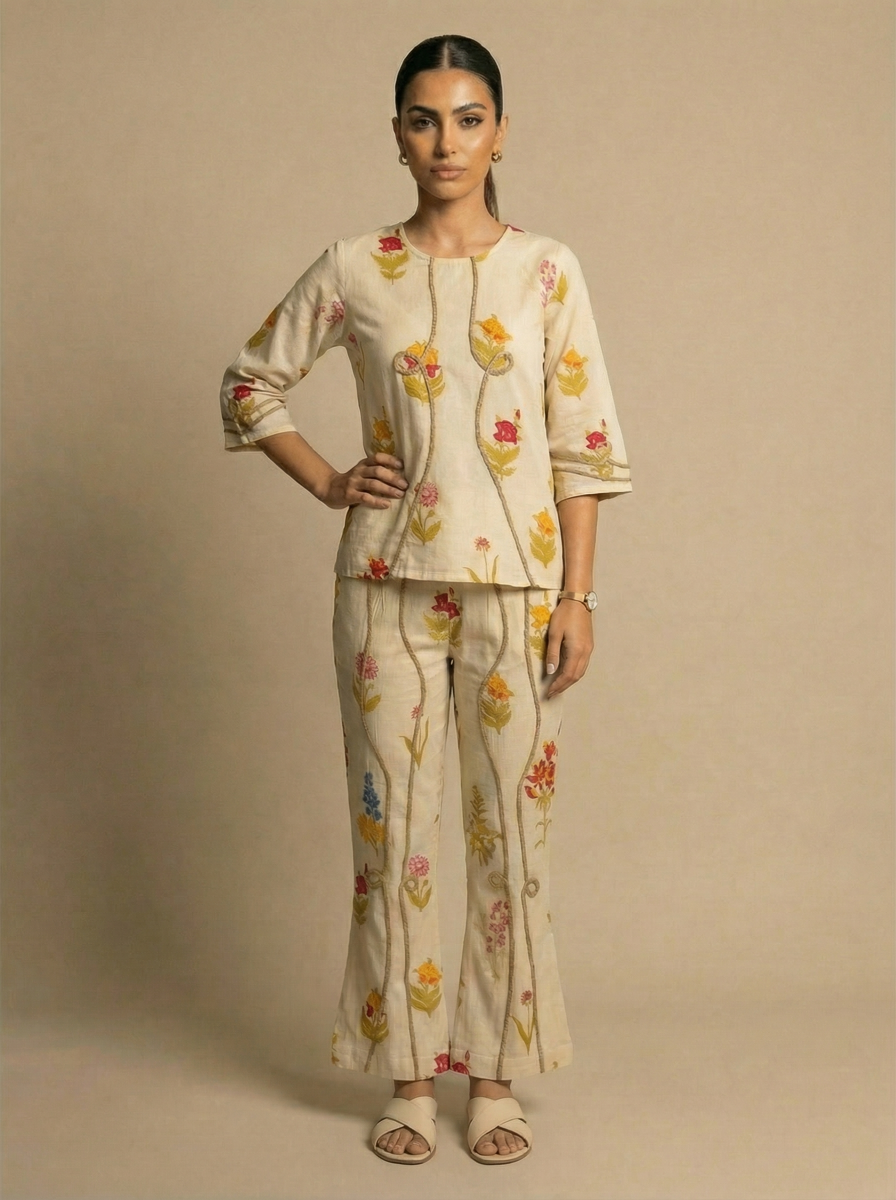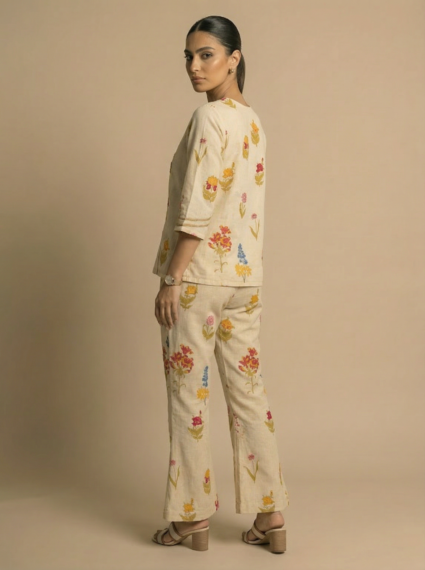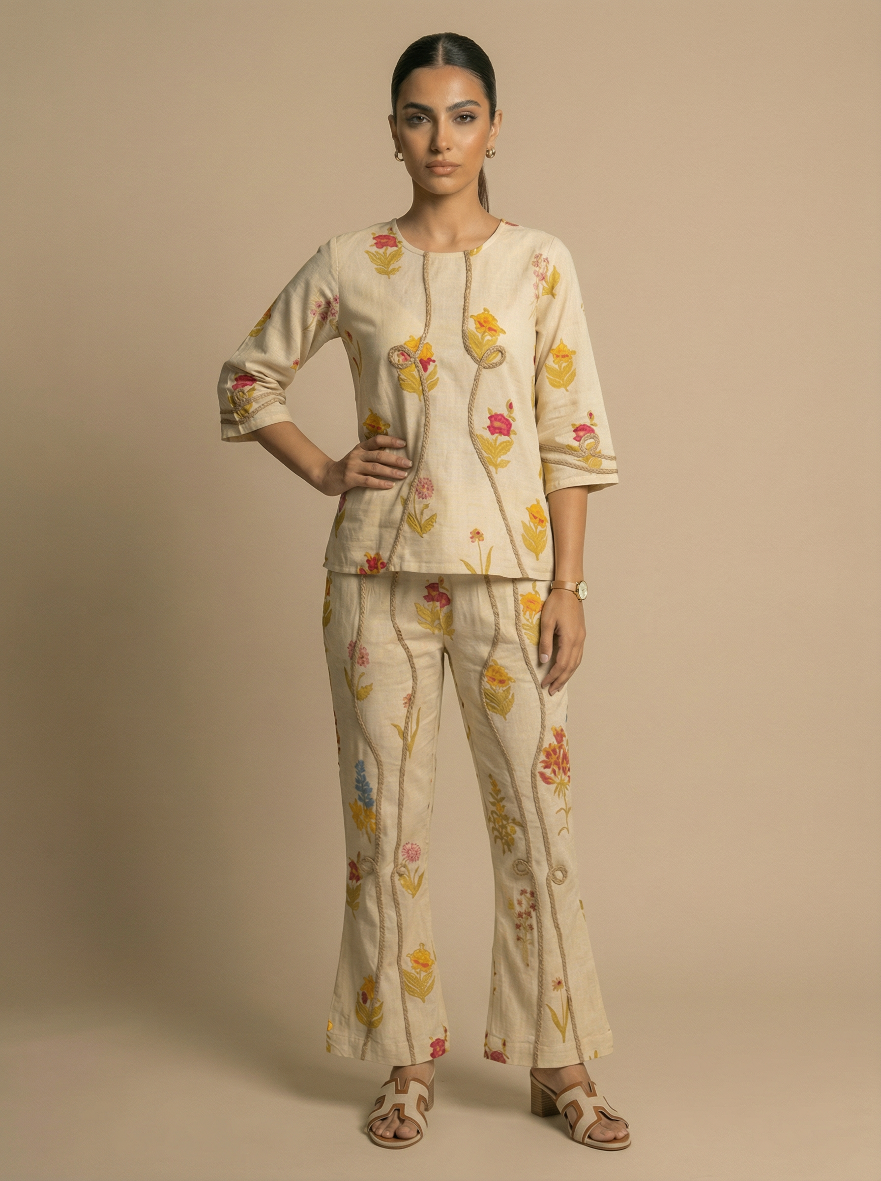 Stay effortlessly stylish with this cream cotton co-ord set featuring a floral print and jute rope work. Made from breathable cotton, it offers all-day comfort and a chic look perfect for brunches, outings, and casual gatherings.