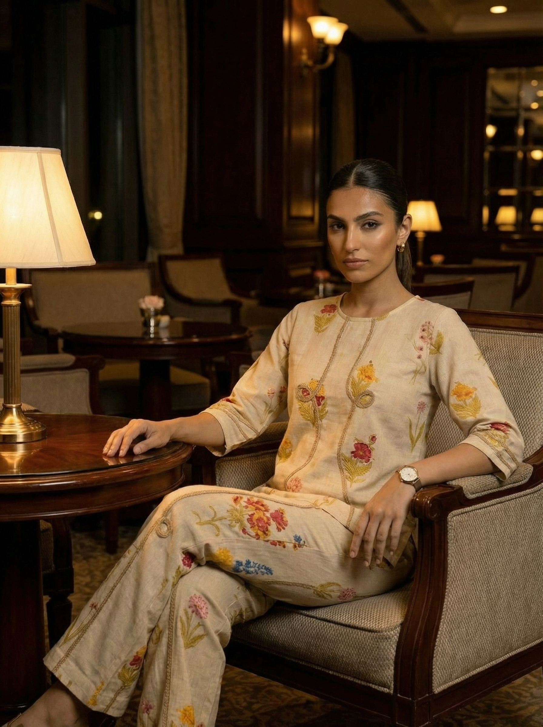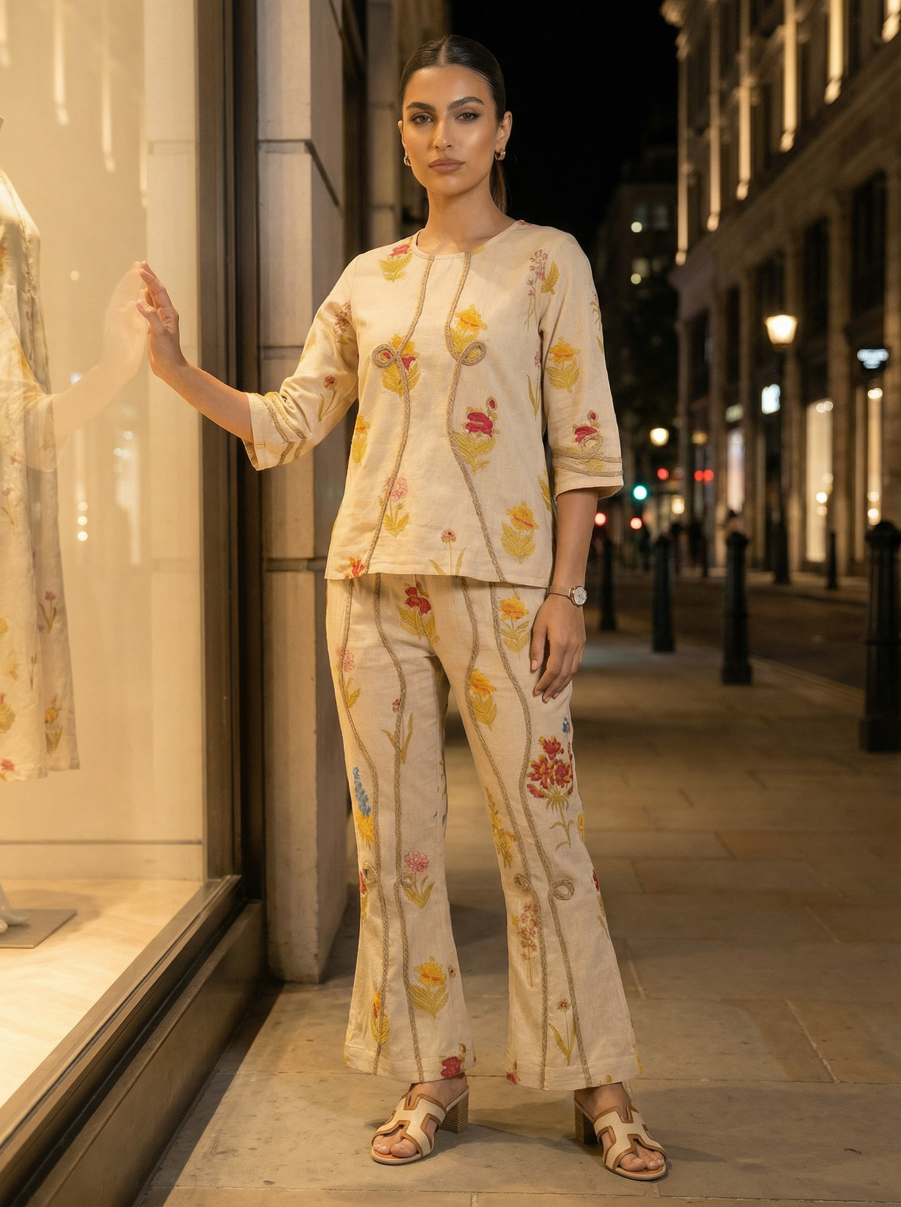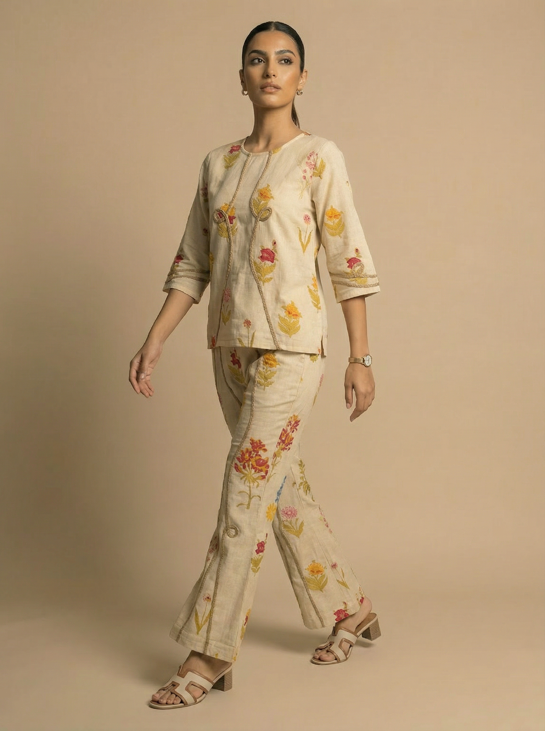 Stay effortlessly stylish with this cream cotton co-ord set featuring a floral print and jute rope work. Made from breathable cotton, it offers all-day comfort and a chic look perfect for brunches, outings, and casual gatherings.