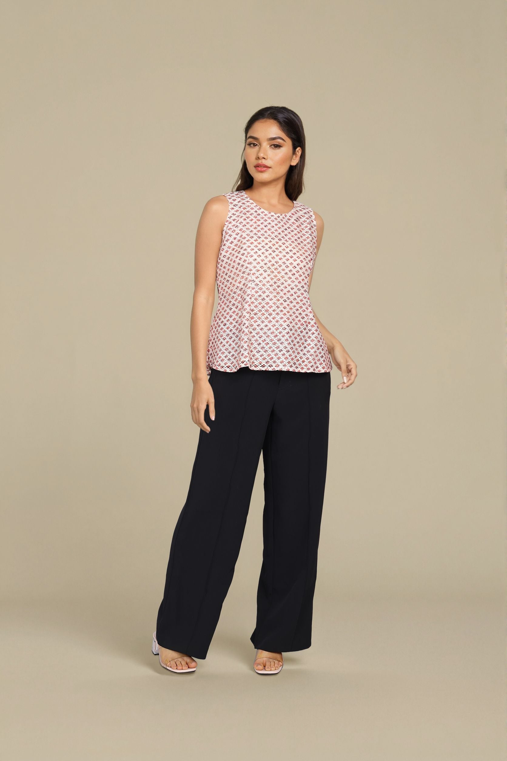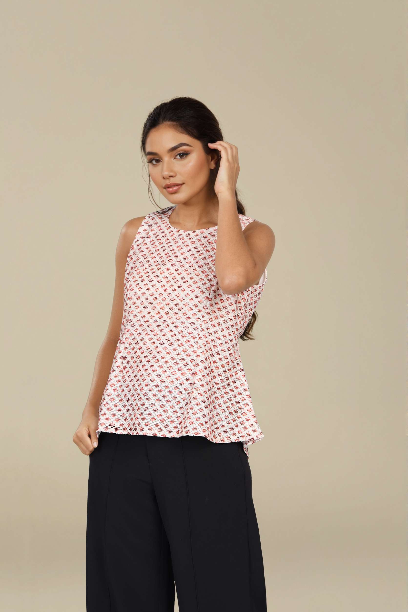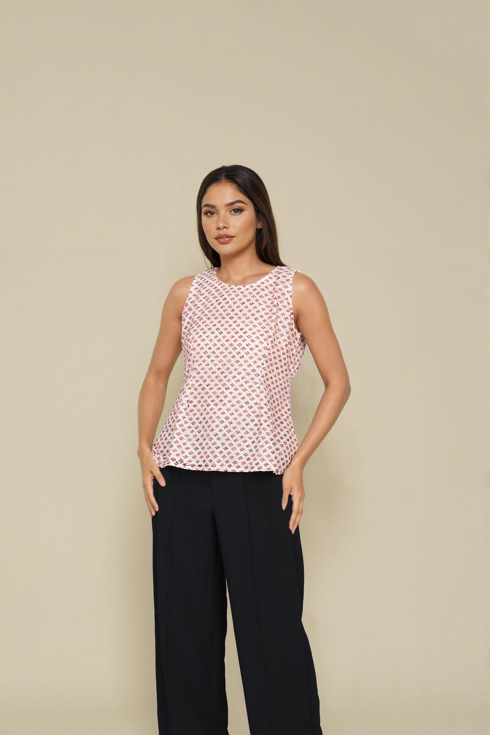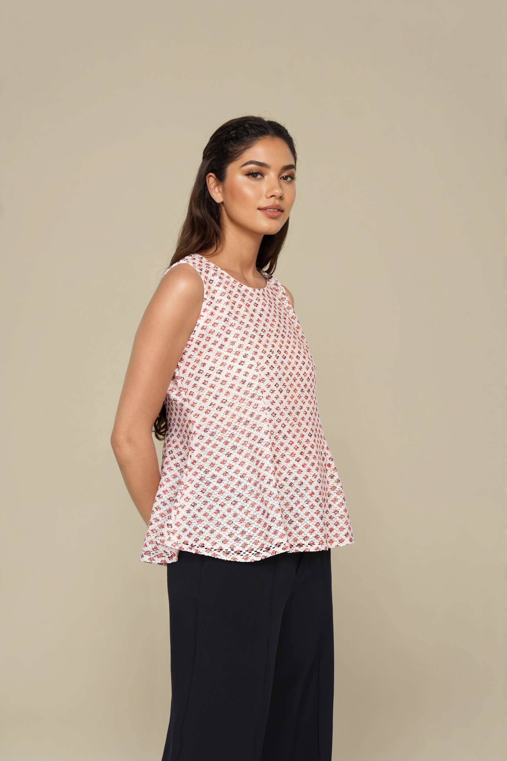 A breathable white crochet sleeveless top designed with a neat round neck. The soft knit pattern keeps it light and comfortable for everyday wear.