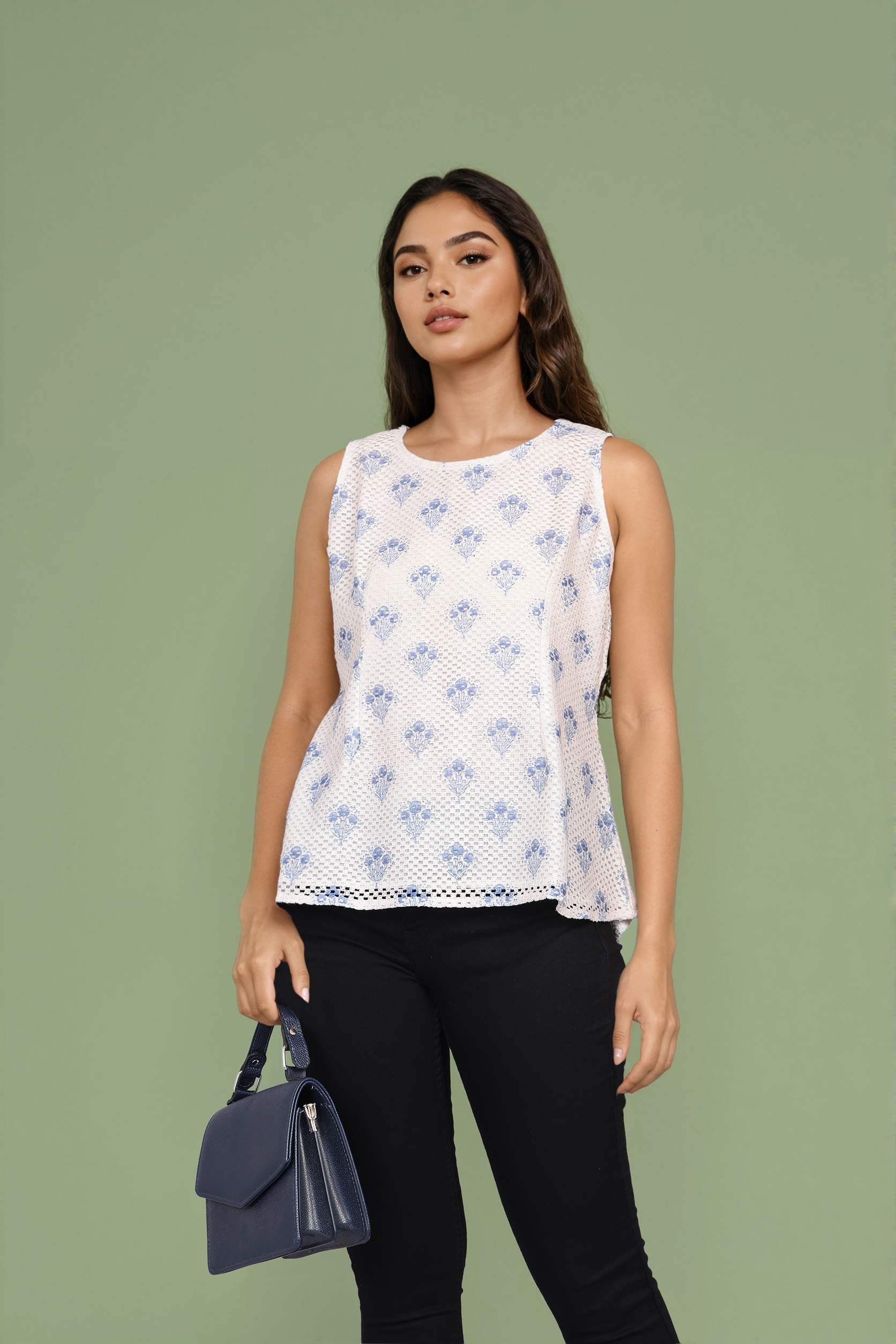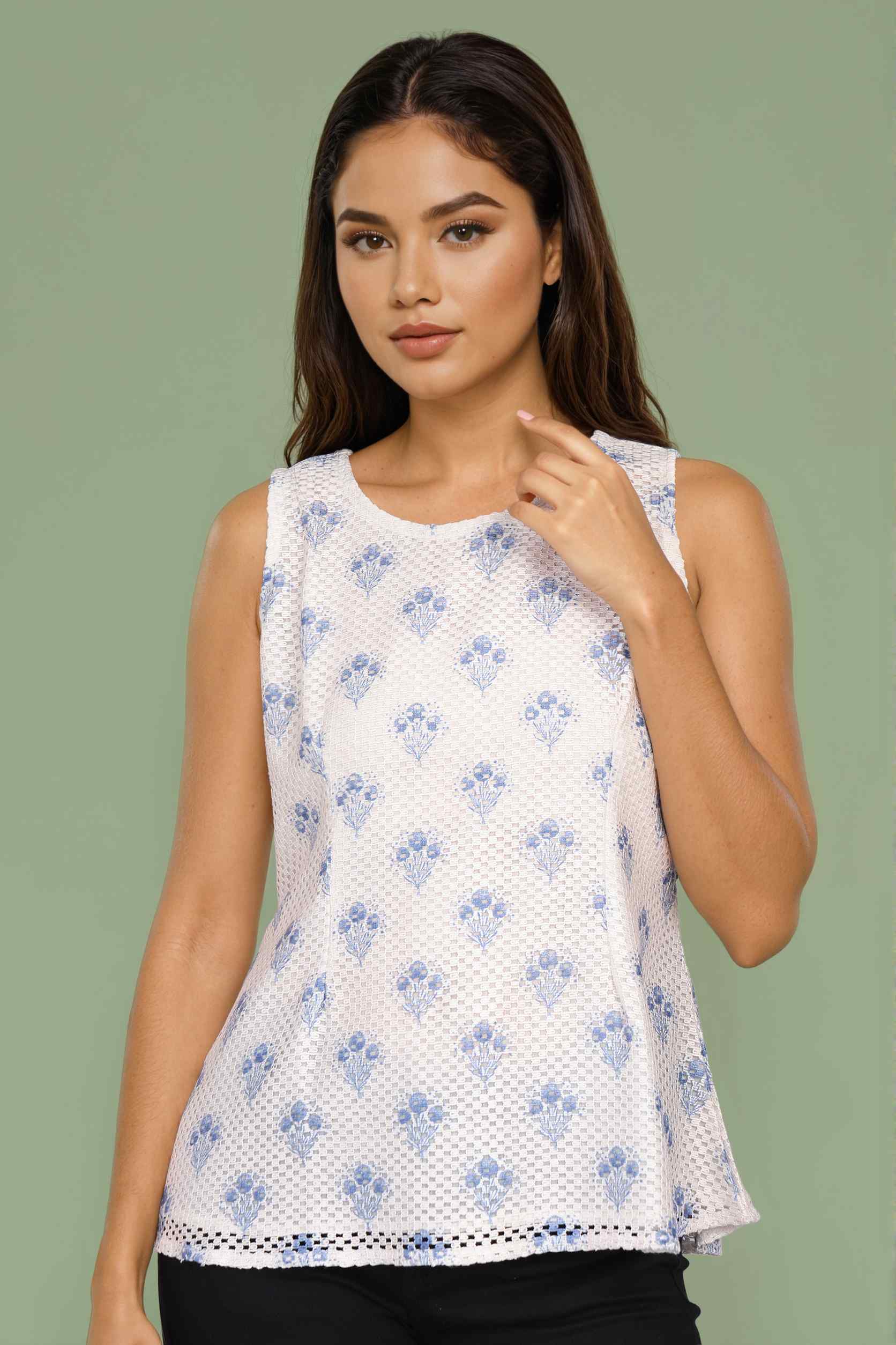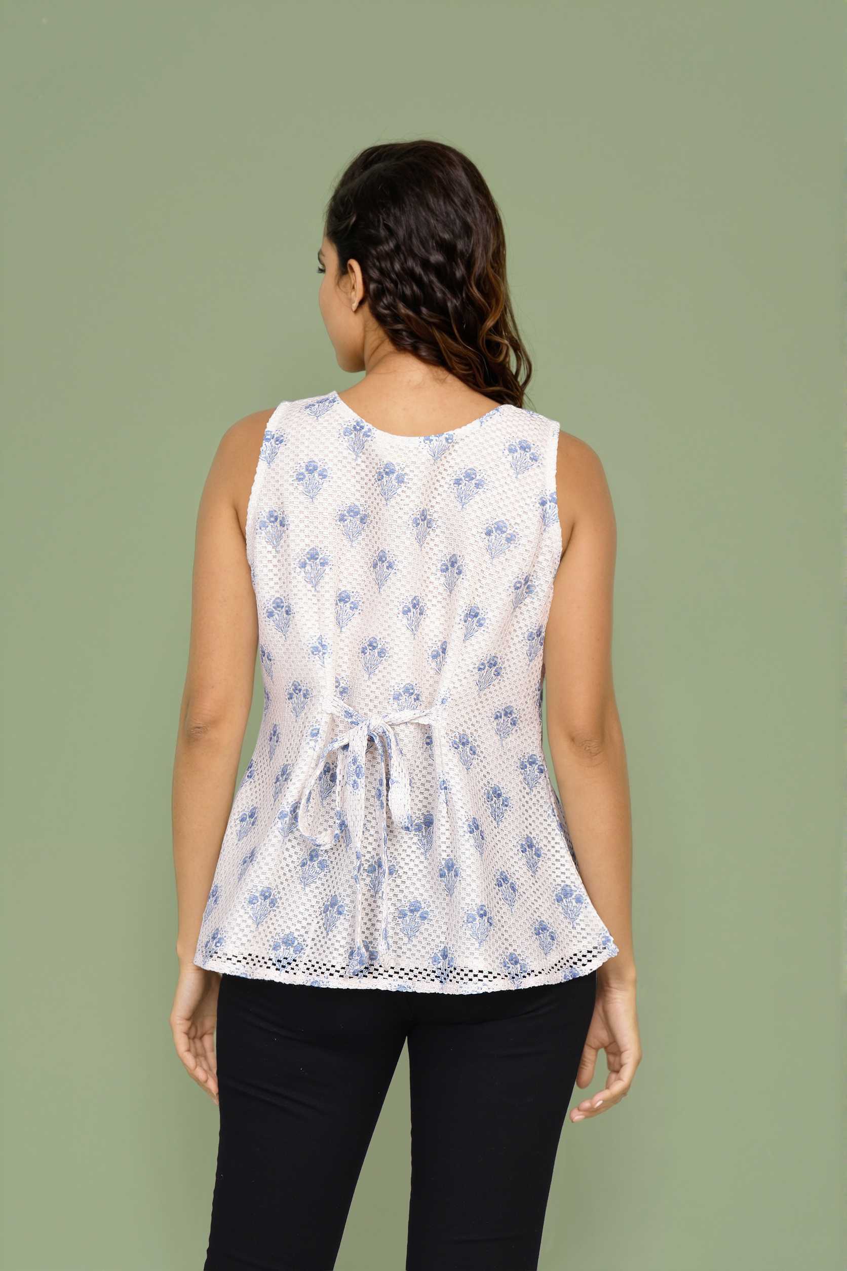 A stylish white ikat floral crochet top made for warm days. The sleeveless cut and textured design add an easy, relaxed feel.