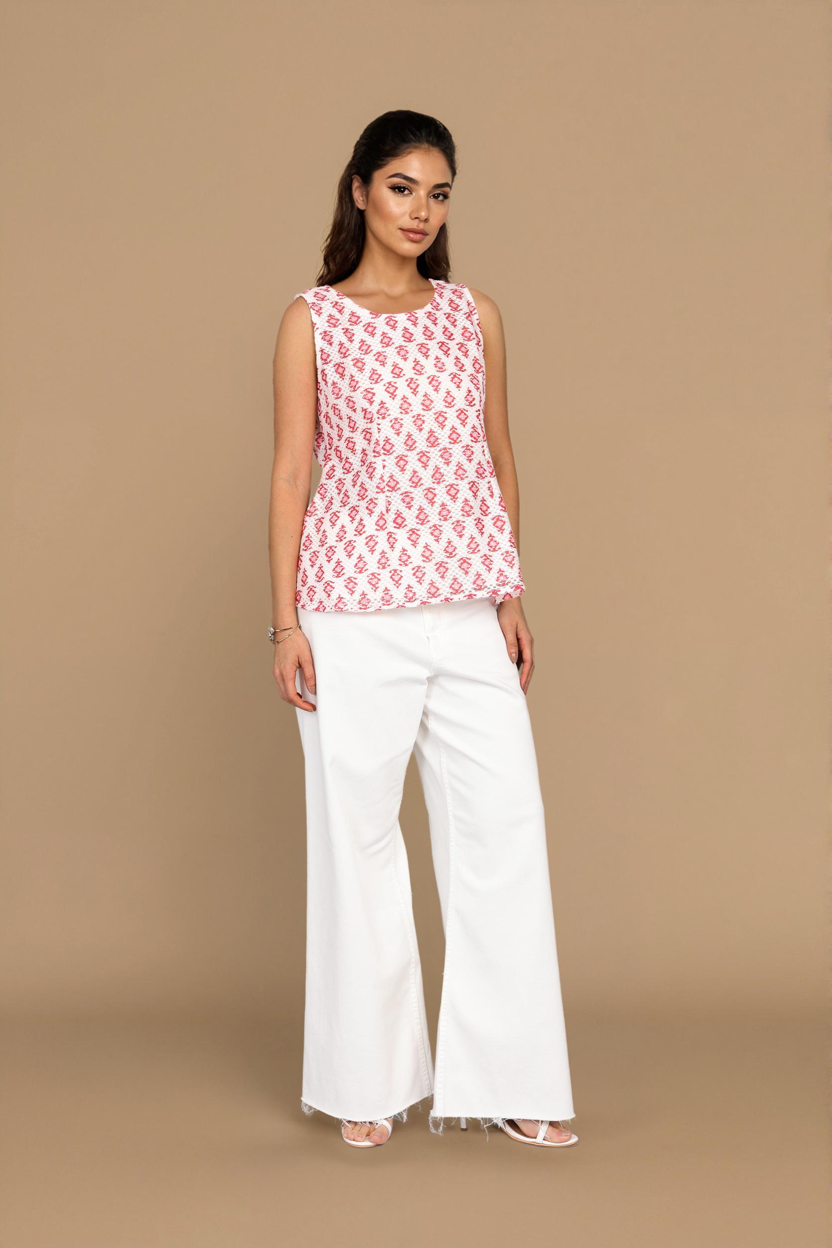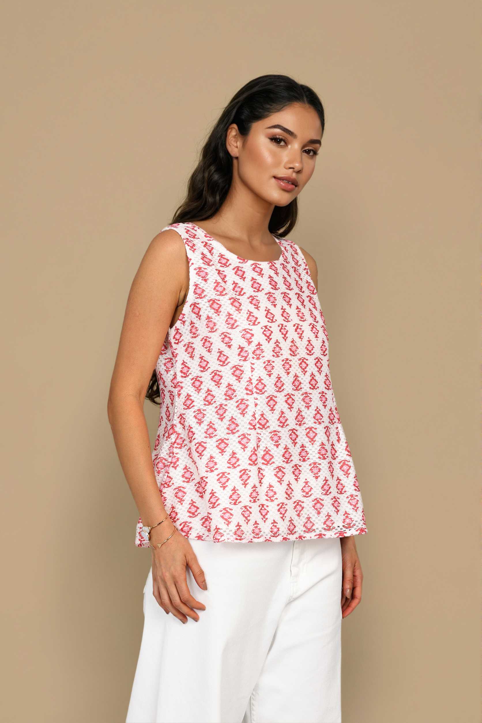 A refined white crochet top featuring a motif-inspired pattern. The sleeveless shape makes it ideal for casual and everyday styling.