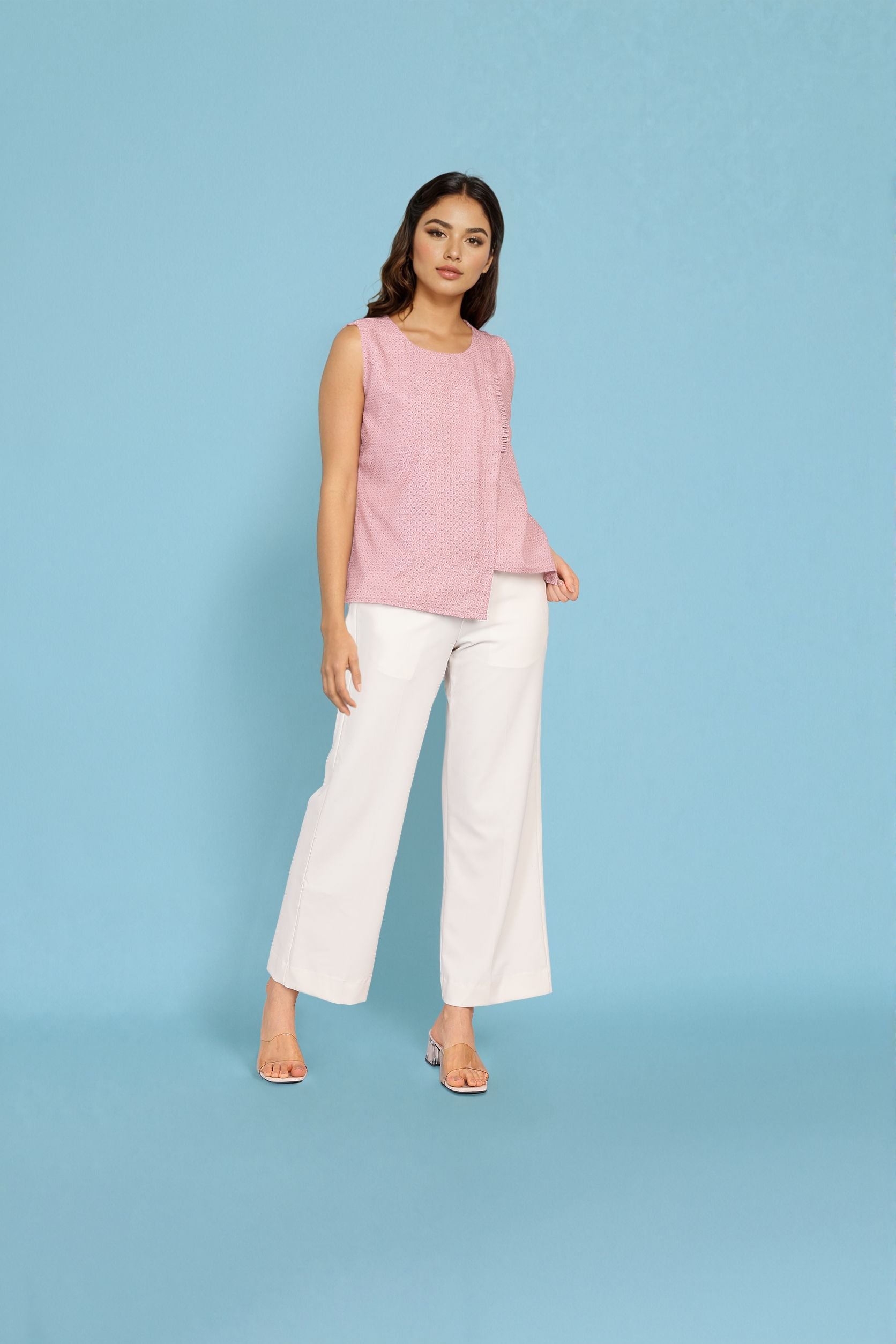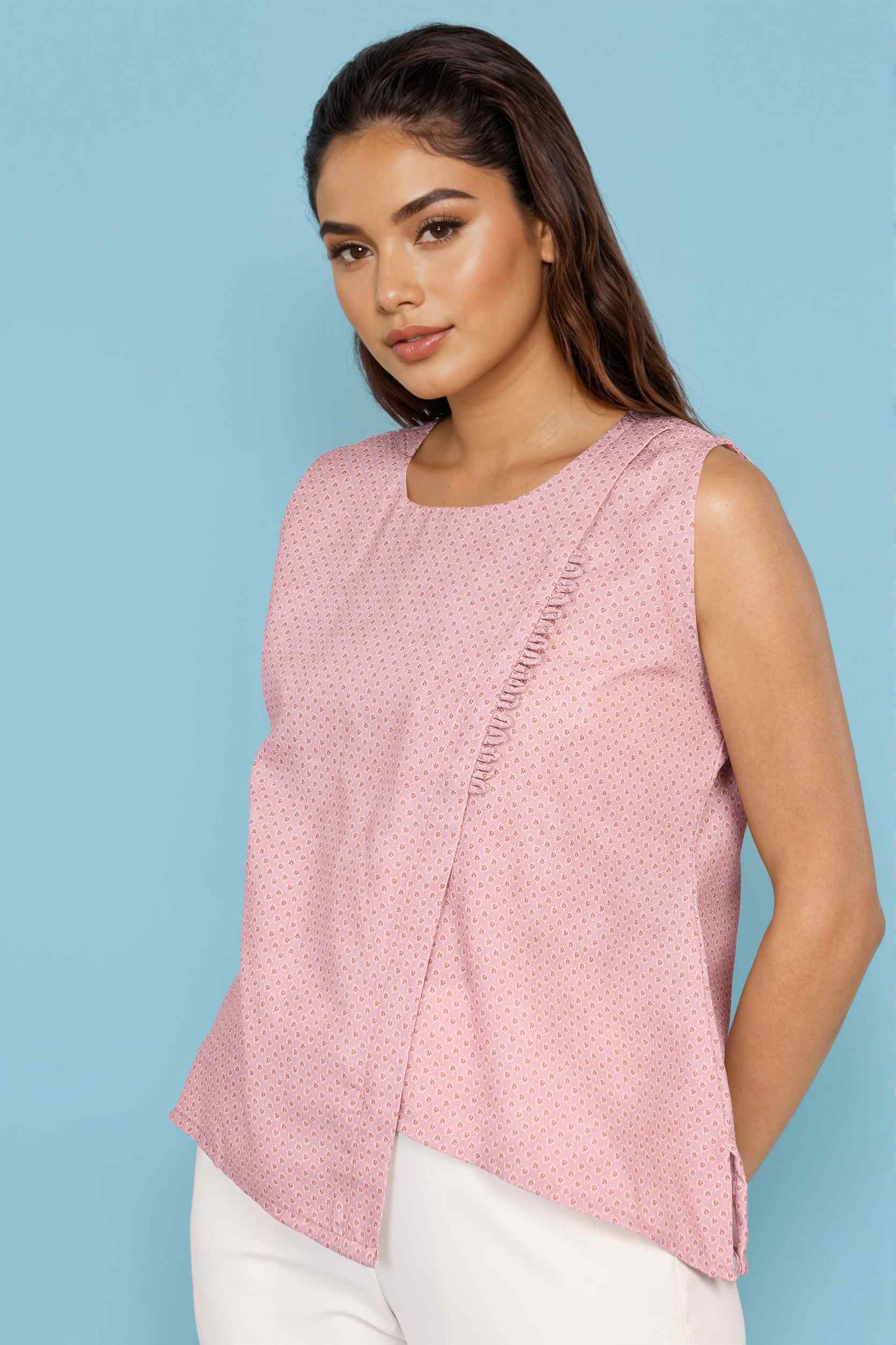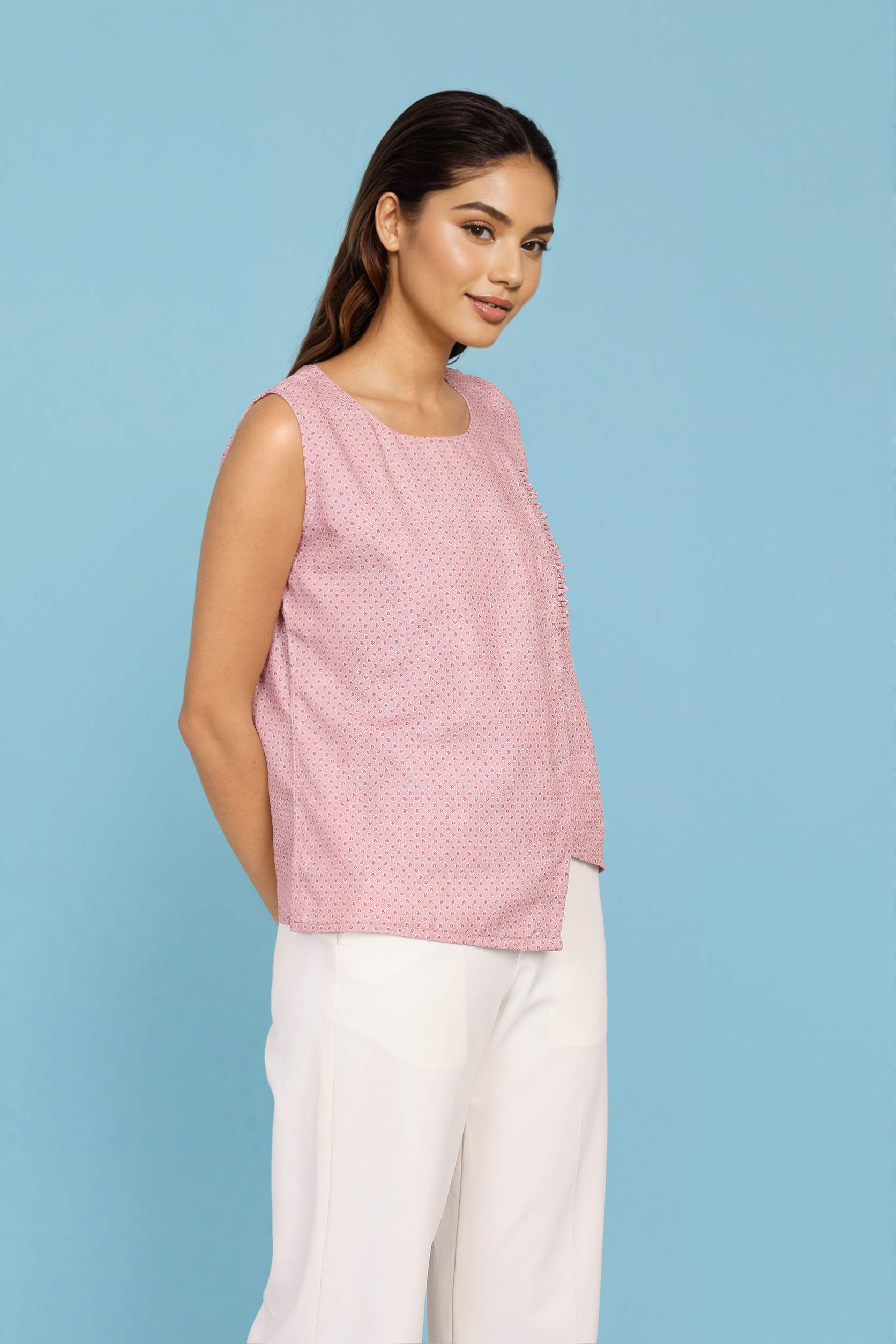 A pink sleeveless top with an allover floral pattern. Easy to style and made for comfortable, everyday wear.