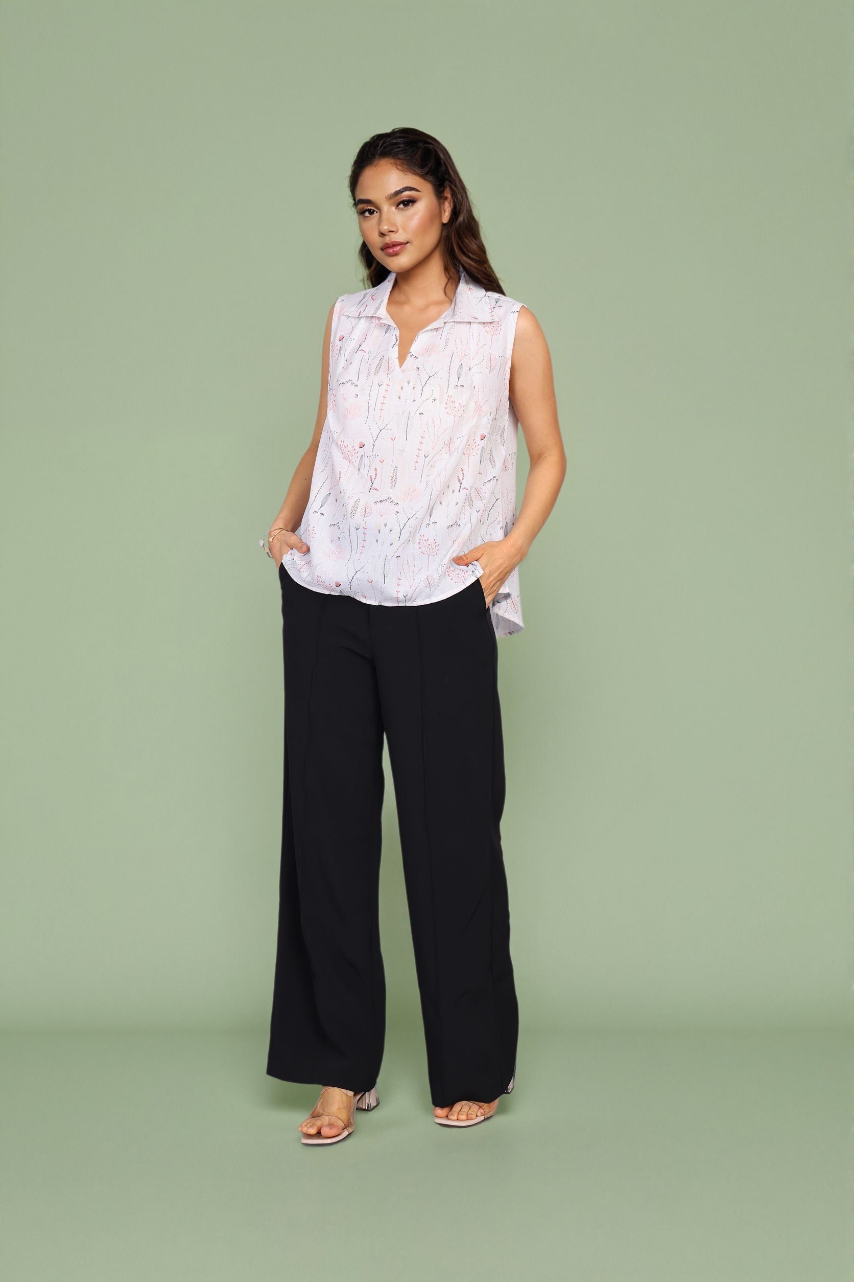 A clean white sleeveless top with botanical floral accents. Soft on the skin and ideal for daily comfort and style.