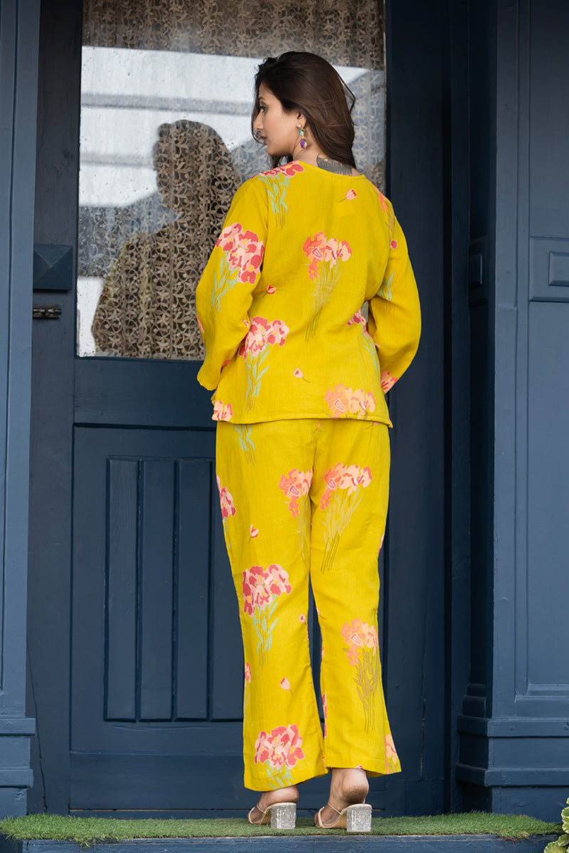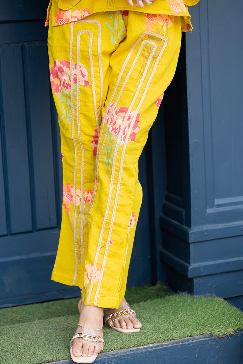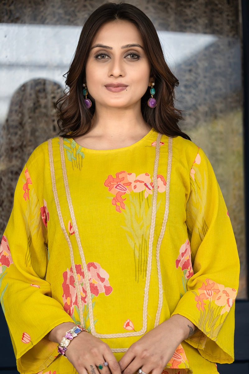 Elevate your casual and party looks with this premium yellow co-ord set crafted in pure cotton. Featuring intricate Jute lace detailing and bold floral prints, this designer piece offers comfort and style in equal measure. Perfect for women who love statement fashion with a breathable, lightweight finish.
